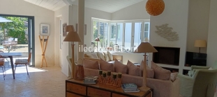 Un grand salon, salle à manger et cuisine ouverte tout équipée. Porte-fenêtre à galandages ouvertes sur une terrasse pour les repas d’extérieur.