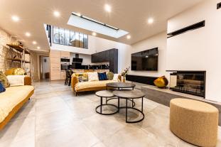 Grande pièce à vivre (50 m2), 2 canapés, 4 fauteuils en rotin, 1 banc osier.