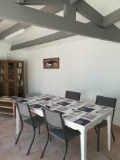 - Une petite pièce de vie avec table à manger et canapé deux places , un fauteuil, ouverte sur cuisine., WIFI et TV . Cheminée . Donnant sur terrasse avec store banne électrique.