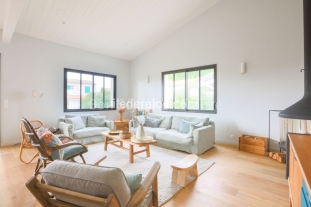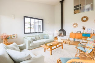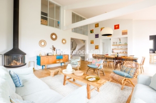 Elle s'articule autour d'un séjour cathédrale de 60 m² avec poèle aux volumes et à la luminosité exceptionnels. Il donne sur une grande terrasse en bois exotique et sur une cuisine semi-ouverte équipée. Arrière-cuisine.