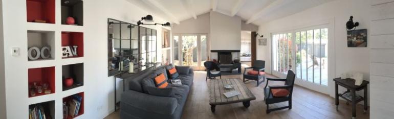 Maison neuve avec étage dans le village, tout confort et très calme. La maison s'organise autour d'une grande terrasse paysagée en bois, et de plusieurs patios dont 1 équipé d'une douche extérieure et d'un auvent pour les vélos. Une grande cuisine vitrée, très lumineuse et entièrement équipée, véritable "coeur" de la maison, dessert d'un côté le salon avec cheminée, la salle à manger et le salon TV et de l'autre 4 chambres: 1 chambre lit 160cm + 2 chambres 2 lits de 80cm (rapprochables) + 1 chambre-salle de jeux avec mezzanine très appréciée des enfants avec ses 3/4 lits de 80 cm. Chaque chambre, y compris la chambre-salle de jeux dispose de sa propre salle de bain ou de douche. Attenants à la cuisine, une buanderie équipée de LL, SL et table à repasser, ainsi qu'un cellier avec congélateur, armoire froide et grands placards facilitent la vie de la maîtresse de maison. A l'extérieur, table et salon de jardin pour 10 personnes. Barbecue à gaz Weber avec plaque de plancha.