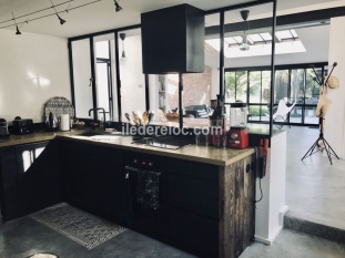 Cuisine baie atelier (13 m2) sur salle à manger et salon de 40 m2 avec baie coulissante