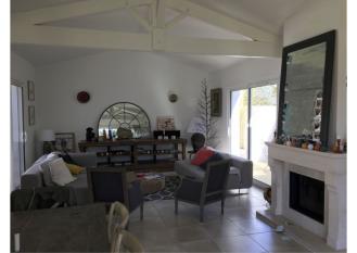 La grande pièce à vivre, ouvre sur un jardin et deux beaux patios aménagés, idéal pour des repas ensoleillés.