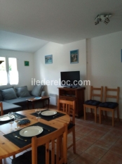 Maison de 54 m2 avec cour et terrasse de 58 m2 avec au RDC une cuisine, un salon/séjour, 1 WC, 1 loggia et au 1er étage 1 chambre avec 1 lit double, 1 chambre avec 3 lits dont 2 superposés, 1 salle de bains avec baignoire.