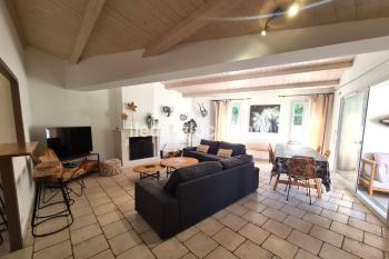 - un grand salon-séjour de 40m² avec 2 canapés, fauteuil et table basse, une cheminée, grande table et chaises, avec une cuisine ouverte de 13m² entièrement équipée (lave-vaisselle, plaques, four, grand réfrigérateur-congélateur, micro-onde, cafetière, bouilloire, et grille-pain... ),