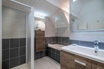 Au rez-de-chaussée, une suite parentale et sa salle de bains avec baignoire et douche et un cabinet de toilette indépendant.