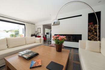 Spacieux salon/salle à manger de 55m2 ouvert sur la piscine par une large baie vitrée pour un effet "dedans / dehors" très agréable
