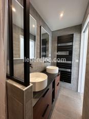 • Les 5 chambres sont toutes dotées de leur propre salle d'eau L'une d'entre elles, une suite parentale, possède une grande baignoire en plus de la douche douche et un WC privatif séparé. Une autre salle d'eau est équipée d'un WC intégré. La chambre parentale est dotée d'un très grand lit double King size (180x200), 3 autres chambres ont des grands lits doubles type queen size (160x200) et enfin une dernière, 2 lits simples de grande taille (lits de 90x200 et non 190) afin que des adultes y dorment, si nécessaire, dans le plus grand confort. Toute la literie est de marque et référence haut de gamme et récente, les matelas faisant 31 cm d'épaisseur. Les draps sont fournis, y compris les serviettes de toilette.