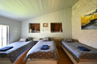 2 grandes chambres spacieuses à l’étage, chacune disposant d’une salle d’eau avec douche à l’italienne et d’un WC indépendant, permettent d’accueillir très confortablement 4 adultes ou 2 adultes et 3 enfants (2 lits double de 180 ou 1 lit double de 180 et trois lits simples de 90 avec possibilité de lit d’appoint pour un enfant ou lit bébé). Le salon TV étant indépendant vous pouvez loger une personne ou un couple supplémentaire sur le canapé lit.