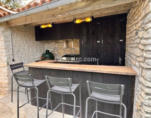 Les repas à l'extérieur : table à manger de 8 a 14 places dans le jardin pouvant être abritée par un parasol + 4 tabourets de bar devant la cuisine d'été