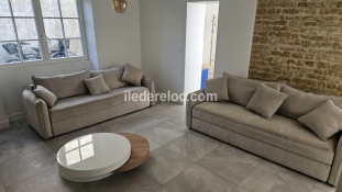 ? Côté salon, profitez d’un espace chaleureux avec un mur en pierre typique de l’île de Ré et une cheminée pour les soirées d’hiver cosy, ambiance cocooning garantie.