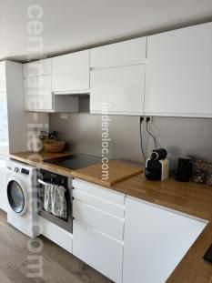 Pièce à vivre lumineuse avec coin salon et cuisine ouverte.