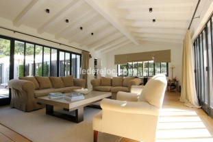 PARTIES INDÉPENDANTES : sur l'arrière de la maison ensemble accessible uniquement par l'extérieur - Chambre de 13,63 m² avec 2 lits de 90, couettes, placard avec penderie et étagères, salle de douche de 4,10 m² avec lavabo, wc - Lingerie avec lave linge et sèche linge - Chambre de 12,89 m² (donnant sur piscine) avec 1 lit de 160, couette, placard avec penderie et étagère, Salle de douche de 4,31 m², double lavabo et wc -