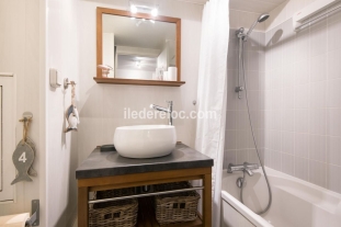 • Salle de bains avec baignoire, vasque, sèche-serviette, sèche-cheveux, placard et WC