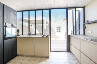 La terrasse dessert directement la cuisine entièrement équipée de 11 m², ouverte sur le coin repas et le salon de 37m² baigné de lumière offrant une vue exceptionnelle sur le port de La Flotte.