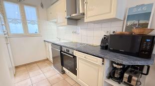 Réfrigérateur, congélateur, plaque de cuisson ( 4 feux, vitrocéramique), double évier, lave-vaisselle, four, micro-ondes, cafetière à filtre Krups, cafetière à capsules Krups, grille-pain, bouilloire, hotte