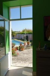 Une grande baie vitrée donne sur le jardin et la piscine.