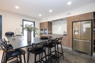 Une cuisine ouverte entièrement équipée, avec un comptoir bar et ses 5 chaises.