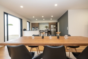 Un salon disposant d’une grande télévision, ouvert sur la salle à manger pouvant accueillir 8 convives, avec un accès direct à la terrasse par une large baie vitrée.