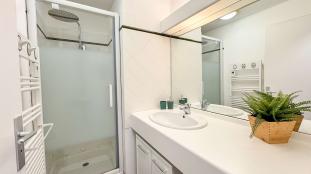 Douche ( 1 marche), vasque, rangements, sèche-serviettes